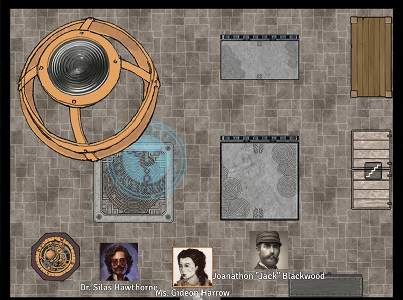Two tables stood nearby, also etched with strange circular patterns that made no obvious sense. The patterns were traced into a short, napped velvet surface atop each table. Each also had a bracket standing at a right angle to the surface, forming an empty frame that seemed to allow something to be fitted into them. The brackets were only 10-inches tall and as wide as the table itself. Blackwood pointed out an articulation point in the northern table that would allow it to bend over the patterned surface.