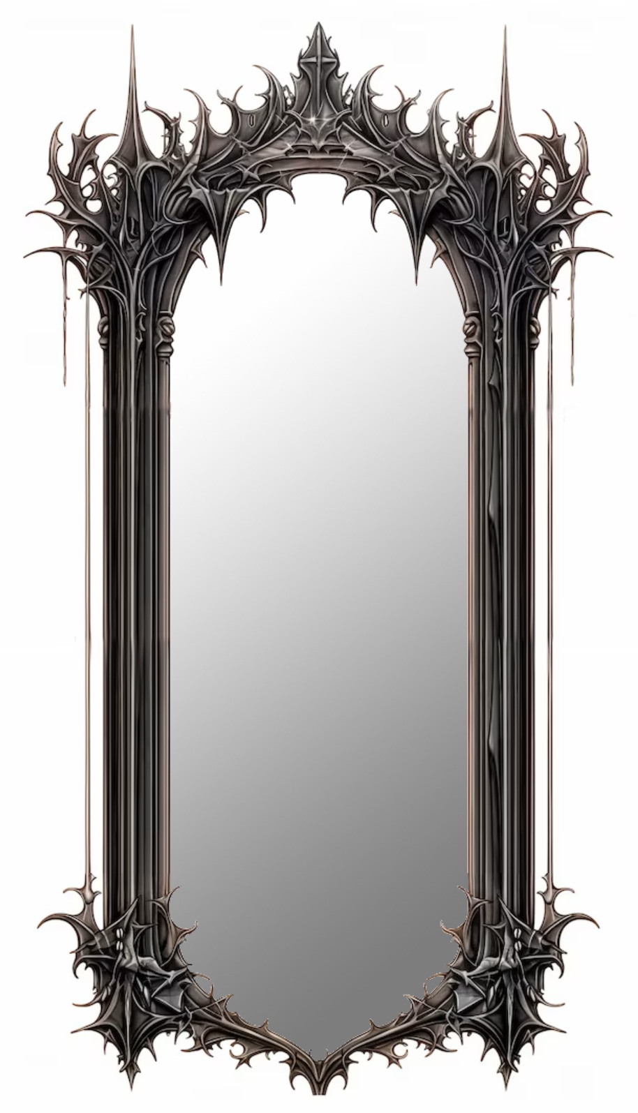 The stage darkened to a spotlight on Doctor Foedemere introduced his main act, summoning two thuggish men, one large one small (as per carney regulation), who wheeled two large objects covered in black drapery onto the stage. These were carefully positioned beside one another mid-stage. Foedemere then dramatically whipped the covers free to reveal twin standing mirrors encased in quite absurdly over-the-top gothic frames: black roses entwined with thorns, ravens, and leering urchins. The mirrors themselves seemed to reflect with uncommon brilliance, as clear as a pond of still water in winter.