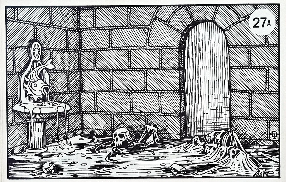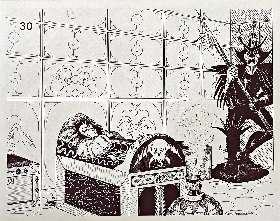 The scenes on the walls showed fields with kine grazing, a copse with several wolves in the background, workers of various races and strange human-animal mixtures—pig-human, ape-human, and dog-human—going about various tasks. Certain of the frescoes show rooms of some building; a library filled with many books and scrolls, the door of a torture chamber, and a wizard’s work room. There were chairs, windows, boxes, bales, doors, chests, birds, bats, spiders, and all manner of things shown on the walls.