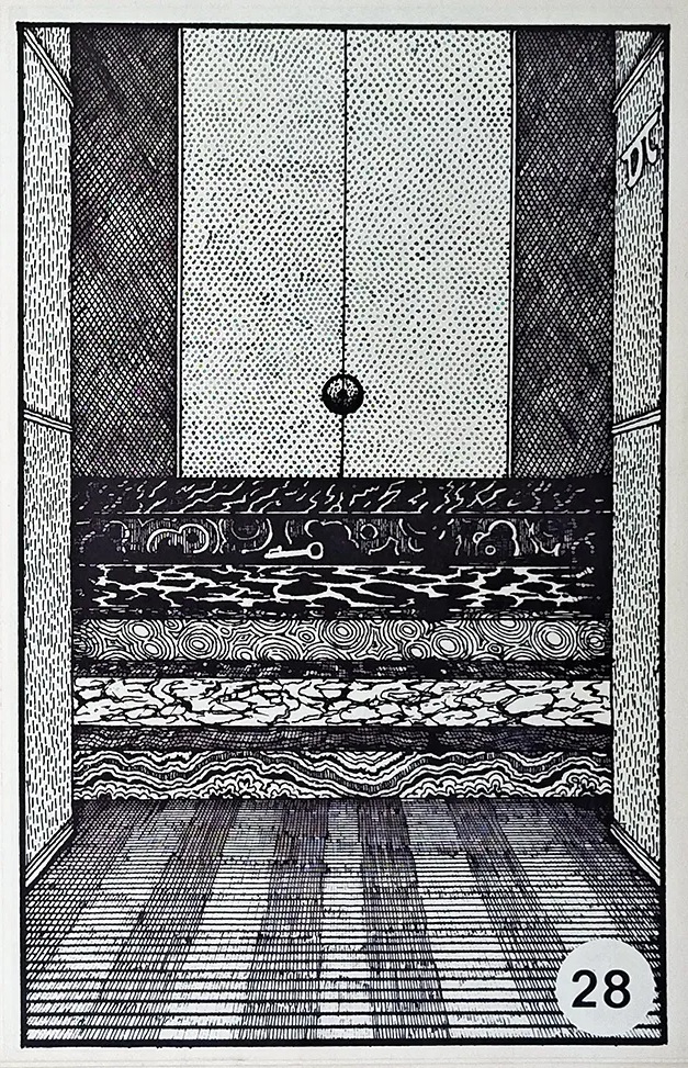 Eli, running along the wall out of terror of the floor, stopped at the fresco of the jail door or torture chamber. A pit lay directly in front, but from the other side he could see pair of painted hands emerging from darkness to grasp the bars of a wooden door, trying to escape the horrors that lay within. The fresco was flat and unhinged, much as Eli peered to see if the painted door might in fact open.