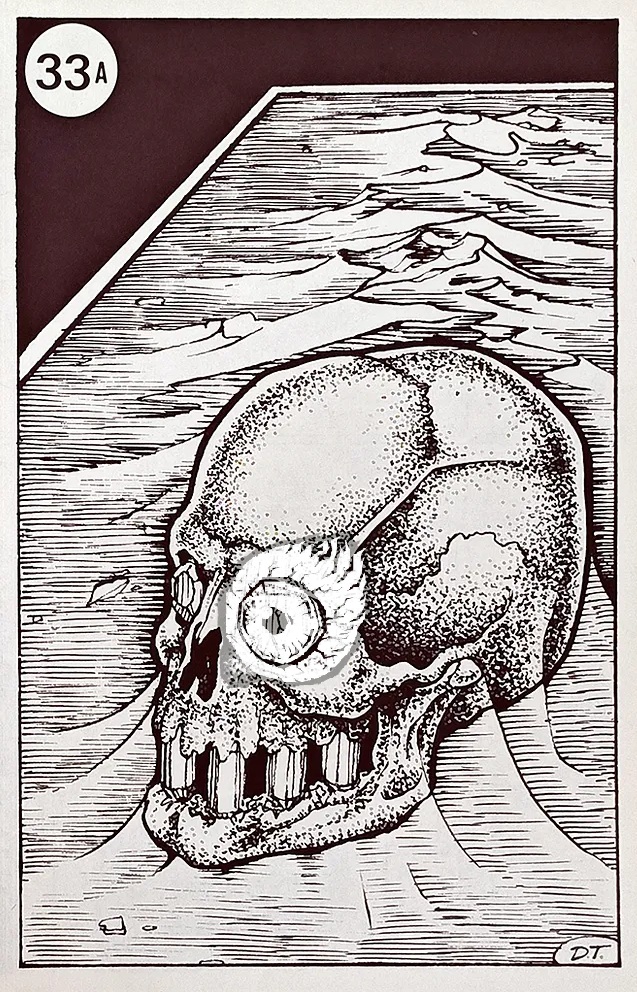 The company arrived at the site of the demilich’s haunt. Before them was a low, flat topped hill, about 200 yards wide and 60 feet high. Only ugly weeds, thorns, and briars grew upon the steep sides and bald top of the mound. There are large black rocks covering the hill arrayed like a human skull, the jagged teeth a grinning death’s head.